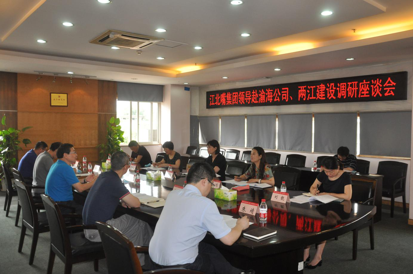 6月24日上午,江北嘴集團監事會主席余從鳳、工會主席羅鴻一行到渝海集團、兩江建設公司調研,渝海集團、兩江建設公司董事長盧明,監事長張青,副總經理樊懷春、丁玉海、朱靖及有關部門負責人參加會議。