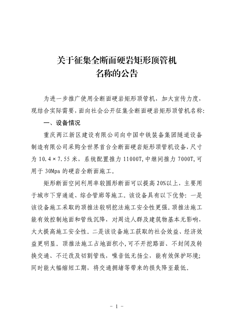 關于征集全斷面硬巖矩形頂管機名稱的公告