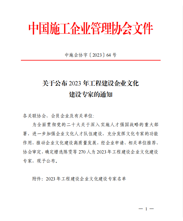 近日,中國施工企業管理協會發布了《關于公布 2023 年工程建設企業文化建設專家的通知》,重慶兩江新區建設有限公司公司監事會主席張青同志受聘“工程建設企業文化建設專家”。