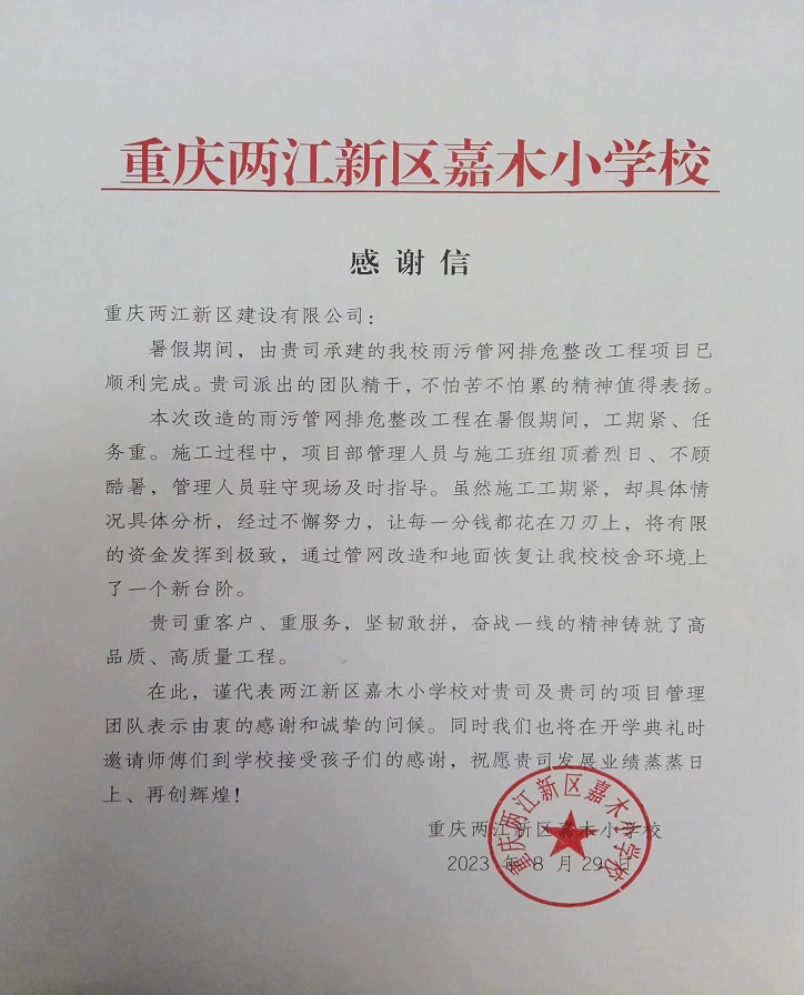 這一封封感謝信,不僅是對兩江建設公司工作的肯定,更是公司后續工作的強勁動力。接下來,我司將繼續為促進兩江新區教育事業高質量發展貢獻自己的一份力量。