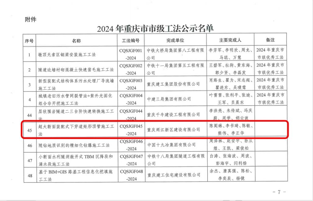來源:圖文/總工辦 林彬 發布日期:2025/3/18 【打印此文】近日,兩江建設公司在施工技術領域取得重大突破,其創新的《超大斷面裝配式下穿矩形頂管施工工法》(CQSJGF045-2024)市級工法成功獲得推廣應用,這不僅提升了項目的工程質量,還進一步擦亮了兩江建設公司企業品牌,為行業發展樹立了新標桿。